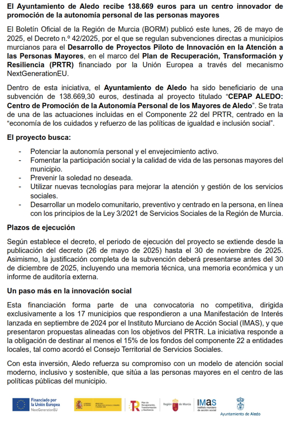 EL AYUNTAMIENTO DE ALEDO RECIBE 138.669 EUROS PARA UN CENTRO INNOVADOR DE PROMOCIÓN DE LA AUTONOMÍA PERSONAL DE LAS PERSONAS MAYORES