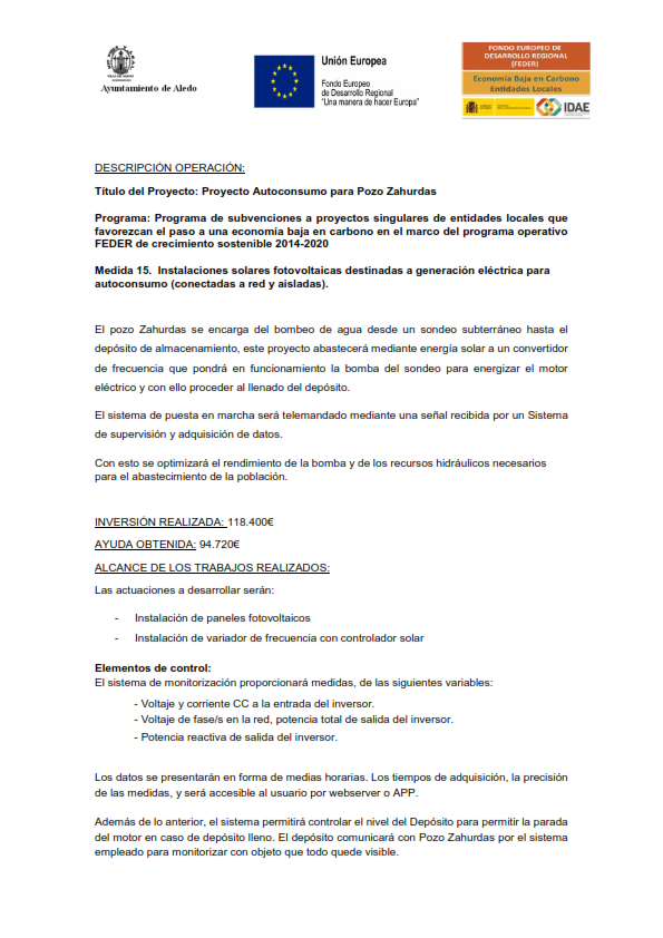 Título del Proyecto: Proyecto Autoconsumo para Pozo Zahurdas