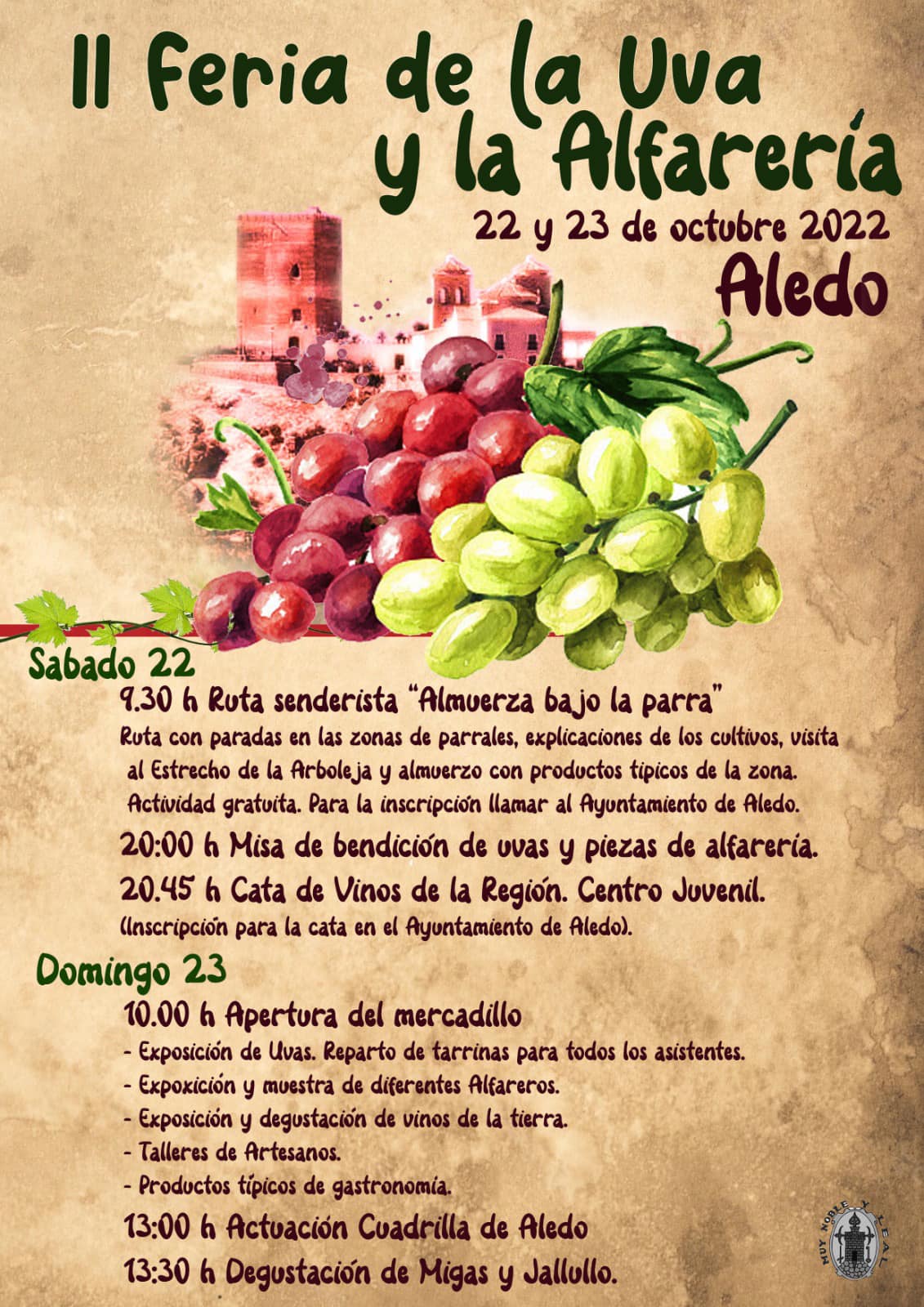Habrá muestras de productos derivados de la uva. Muestras de alfarería, cosméticos hechos con uva, vinos, vermut, talleres de artesanos ..y música en directo con la Cuadrilla de Aledo. Para finalizar una degustación de migas y Jallullo.