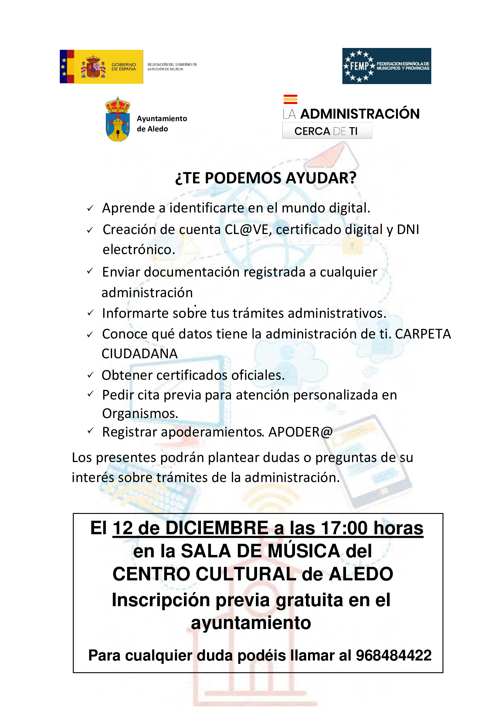 Se explicará como enviar documentación a la administración, podrás informarte sobre todos tus trámites administrativos, creación de cuenta CL@VE, certificado digital y DNI electrónico, pedir cita en diferentes organismos y como mirar su CARPETA CIUDADANA, entre otros trámites.