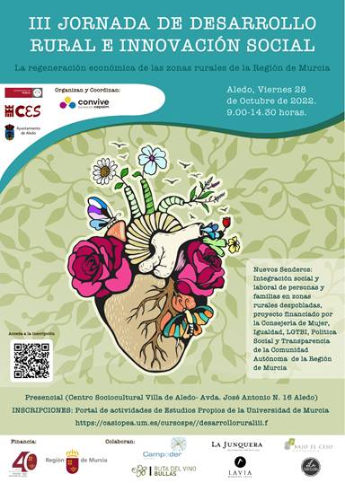Esta jornada se enmarca en la colaboración que mantienen desde hace tres años el Grupo de Investigación de Economía Agraria y Desarrollo Rural de la Universidad de Murcia y CONVIVE Fundación Cepaim, siendo la vocación de esta edición la de generar un espacio de debate sobre los desafíos que la pérdida de población está suponiendo en muchos municipios y zonas rurales de la Región de Murcia, así como de presentación de experiencias innovadoras desarrolladas con el fin de aumentar las oportunidades de empleo y económicas en los territorios rurales.