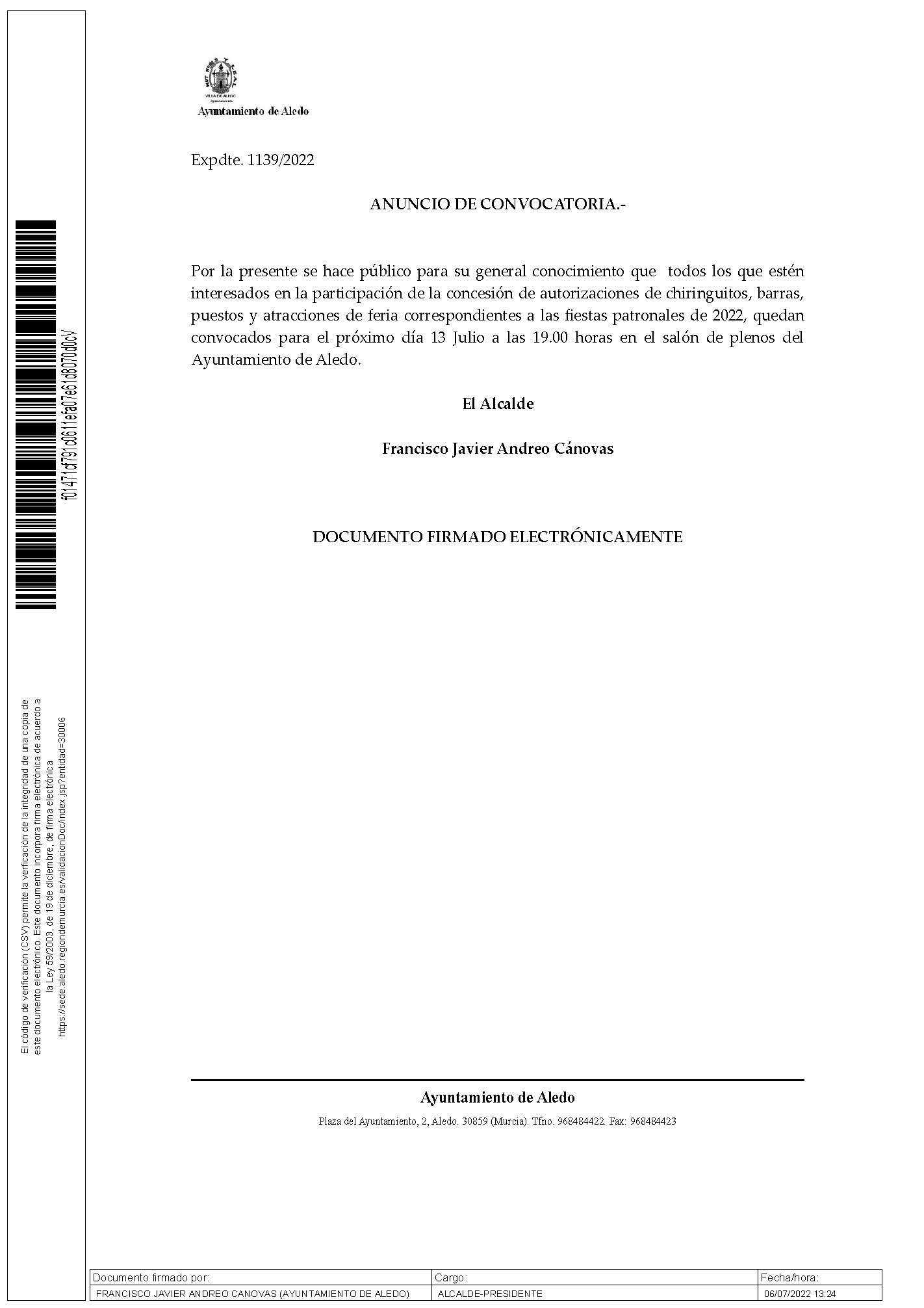 ANUNCIO CONVOCATORIA CONCESION AUTORIZACION CHIRINGUITOS, BARRAS, PUESTOS Y ATRACCIONES FIESTAS 2022