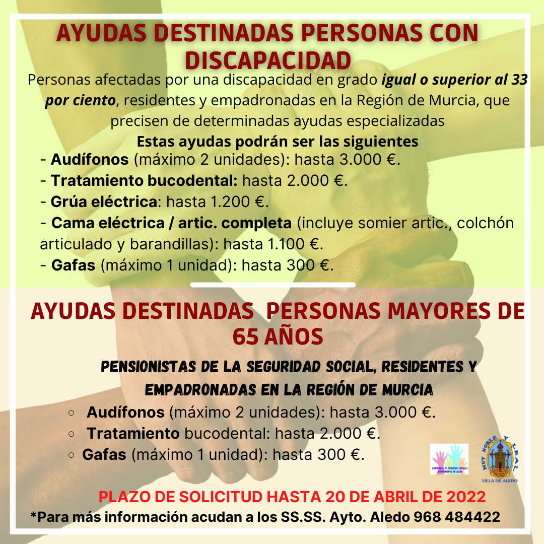 La finalidad de esta convocatoria so conceder ayudas a personas afectadas por una discapacidad en grado igual o superior al 33 por ciento, residentes y empadronadas en la Región de Murcia, que precisen de determinadas ayudas especializadas y a personas pensionistas de la Seguridad Social o sus respectivos cónyuges, residentes y empadronadas en la Región de Murcia.