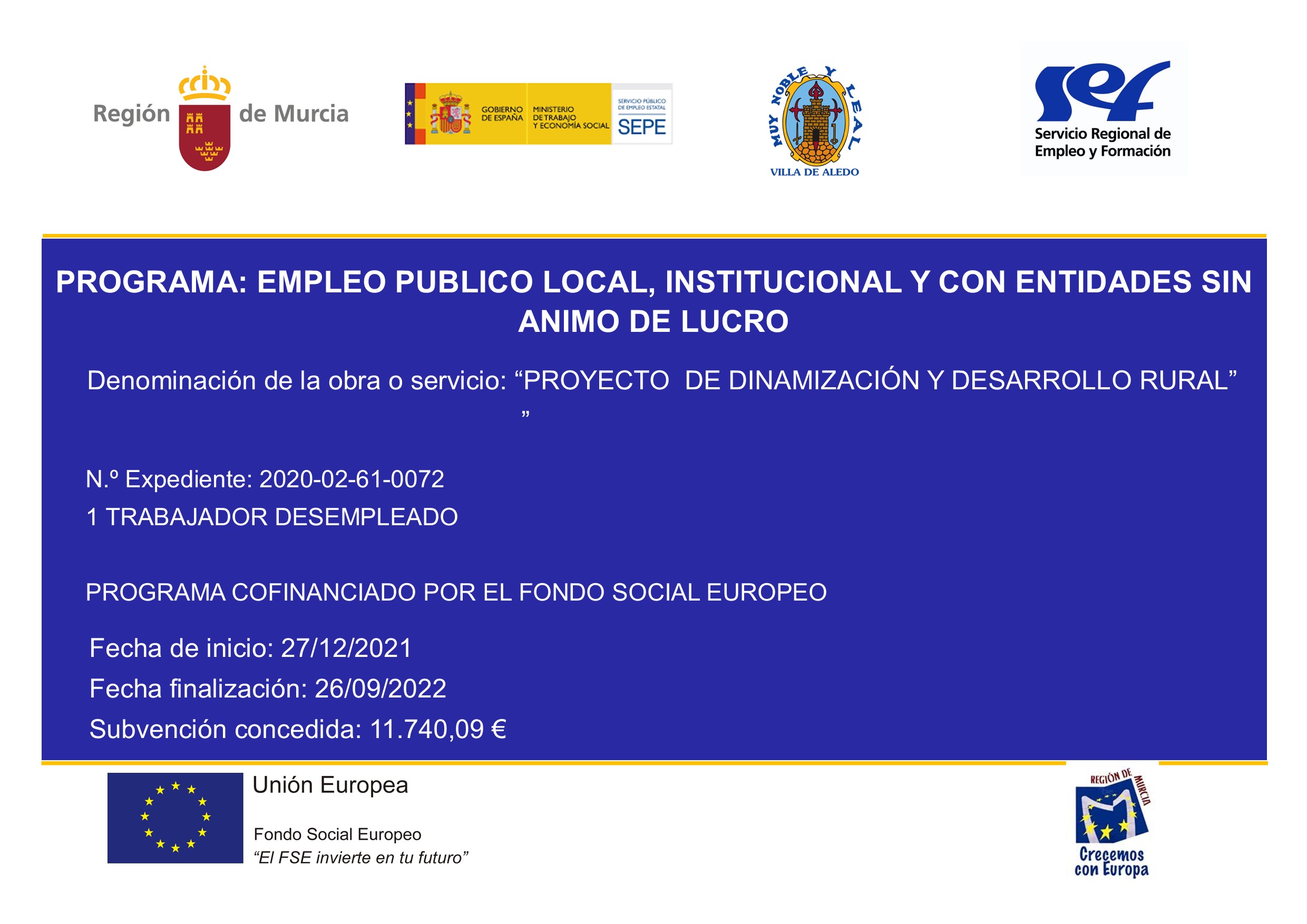 El Ayuntamiento de Aledo ha recibido una subvención del Servicio Regional de Empleo y Formación para la contratación de personal para llevar a cabo este proyecto.