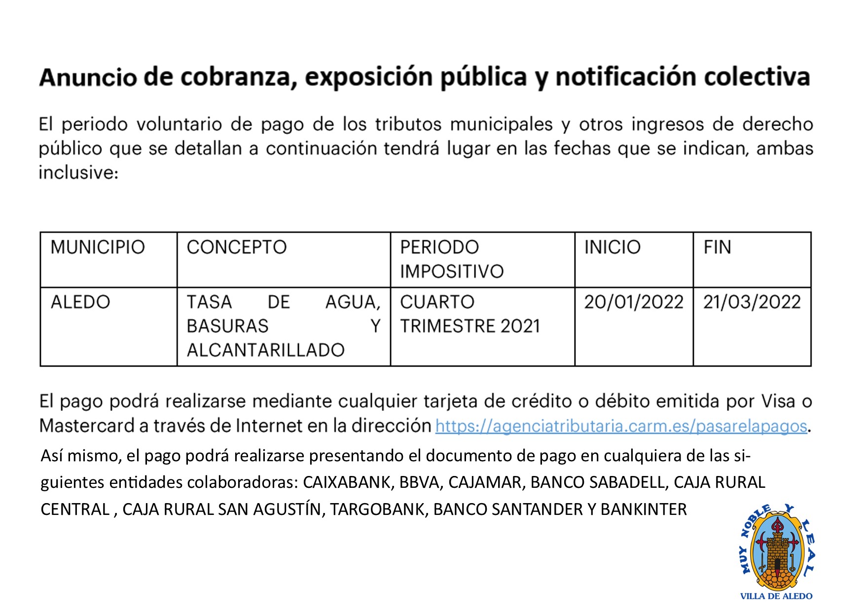 COBRO IMPUESTOS TASAS DE AGUA , BASURA Y ALCANTARILLADO.