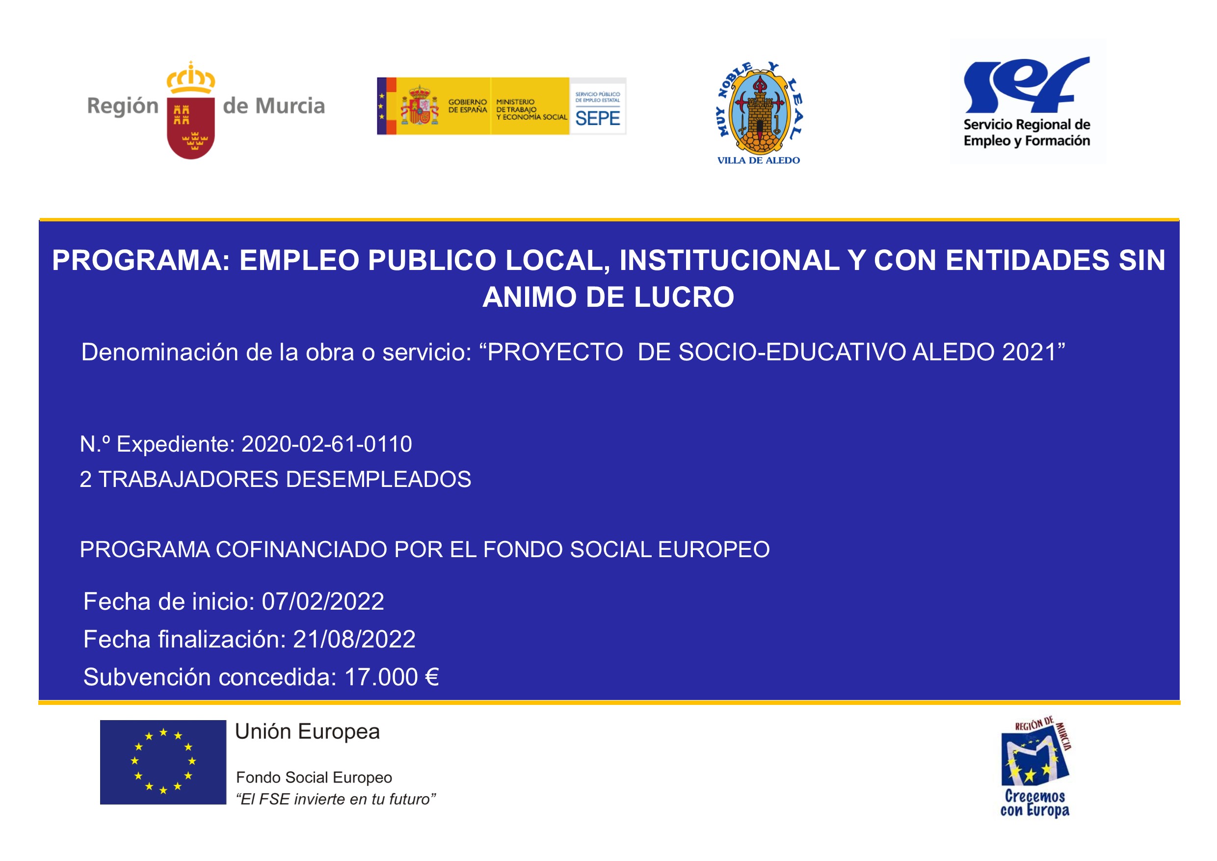 El Ayuntamiento de Aledo, el pasado 7 de febrero de 2022, inició el programa de Empleo Público Local 2021, con la contratación de dos educadores en el marco del programa de Empleo Público Local subvencionado por el Servicio Regional de Empleo y Formación (SEF).