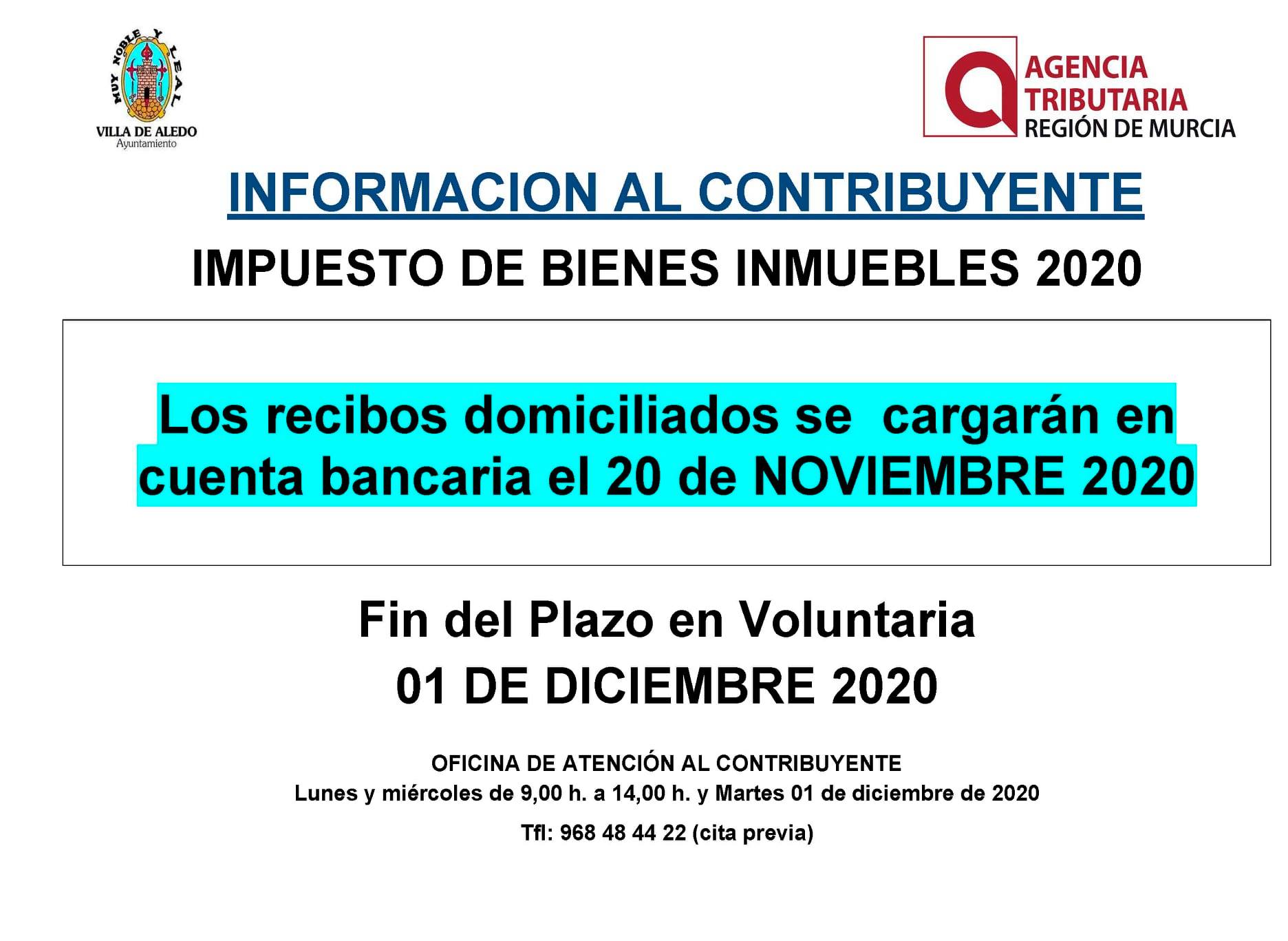 Se informa al contribuyente que la domiciliación de los recibos correspondientes al pago del IBI 2020, se cargarán en cuenta, mañana viernes 20 de noviembre 2020. Además se recuerda que el plazo fin de voluntaria finaliza el día 1 de diciembre de 2020.