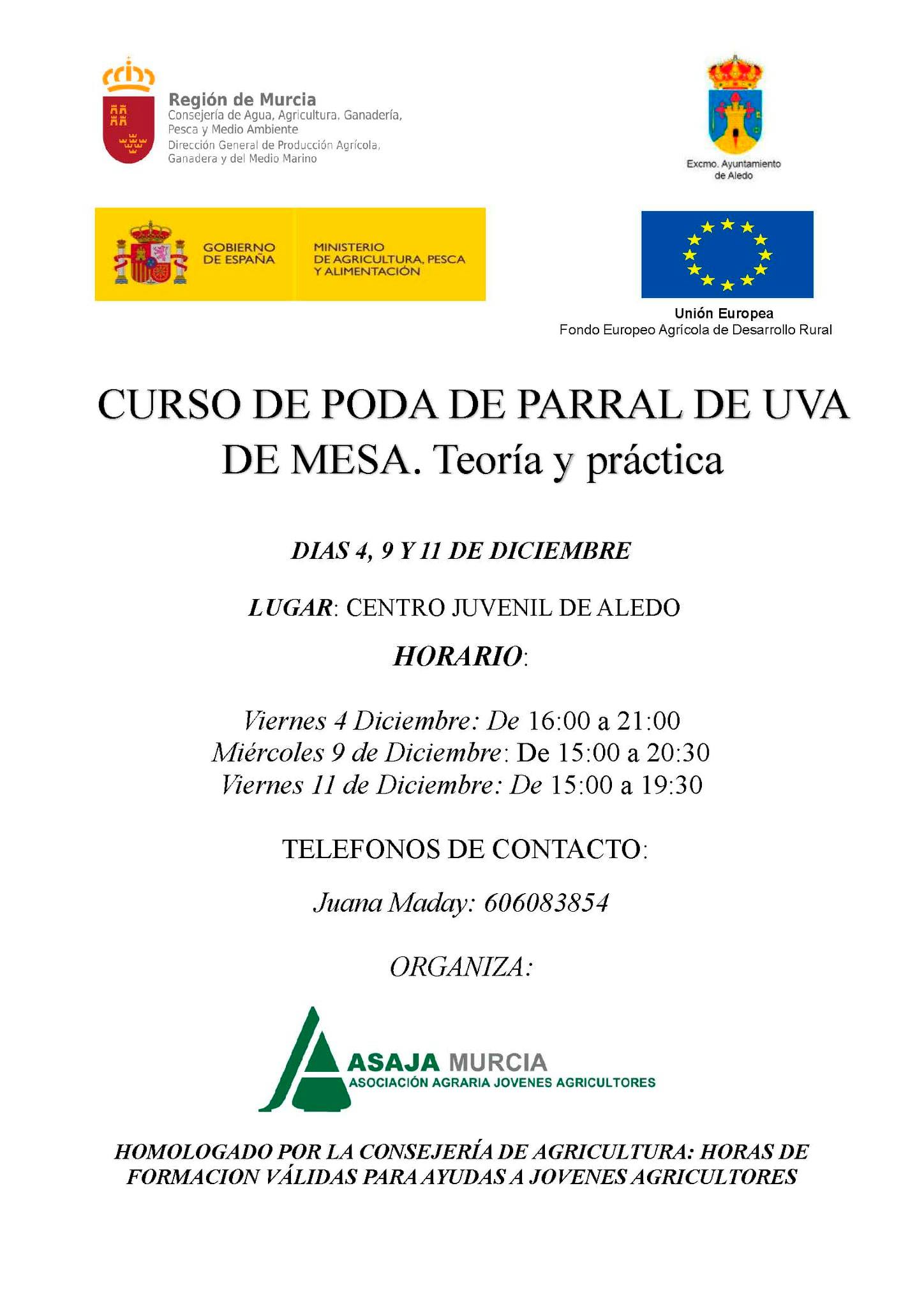 Os presentamos el curso que se va a realizar el próximo mes de diciembre en Aledo, sobre Poda de parral de uva de mesa, organizado por ASAJA en colaboración con el Ayuntamiento de Aledo. Los días de formación y horario os las dejamos a continuación.