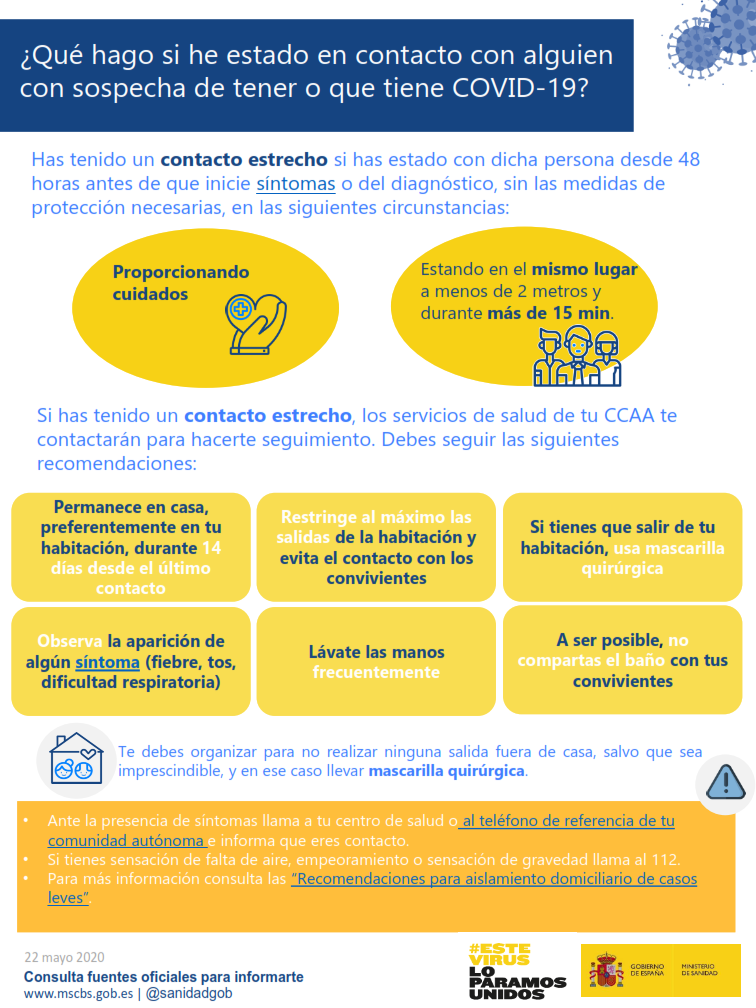 Si has estado en contacto directo con un positivo confirmado, es decir, si has estado a menos de 2 metros de distancia sin protección durante más de 15 minutos, o tienes síntomas compatibles, ponte en contacto con tu consultorio médico o en el teléfono gratuito 900 12 12 12 y sigue sus indicaciones de guardar cuarentena o aislamiento.