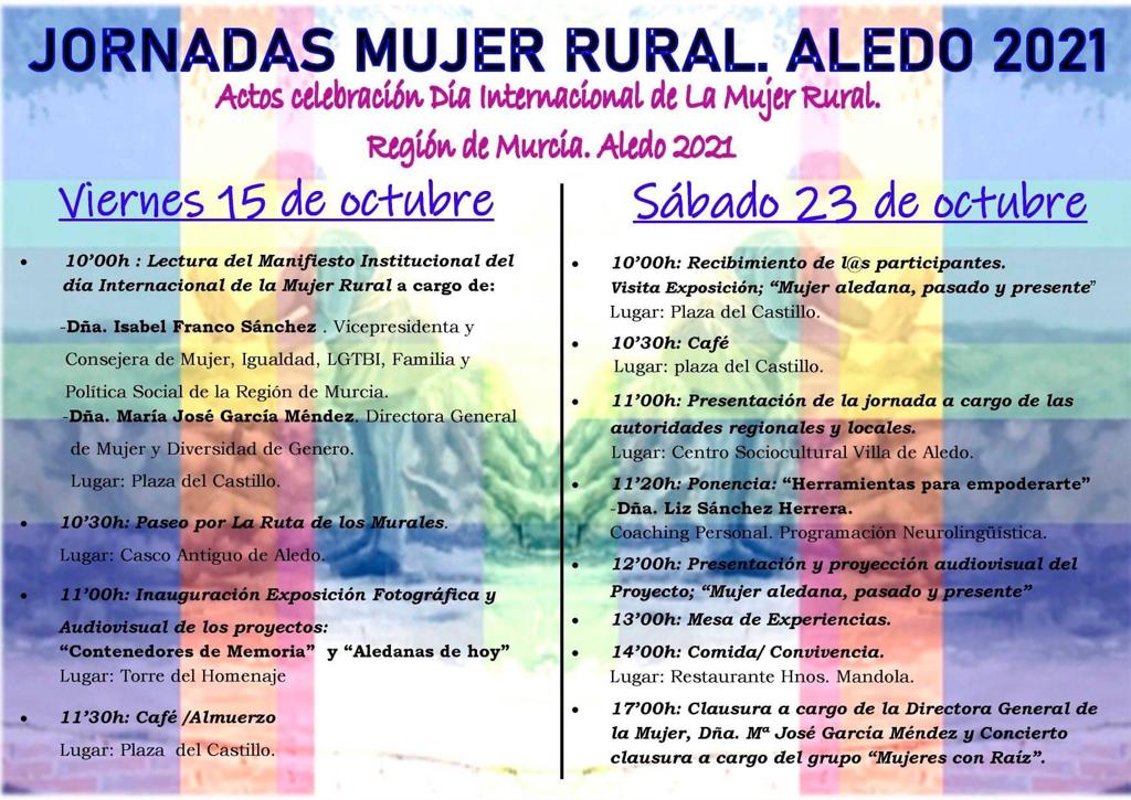 Con motivo de la celebración del Dia Internacional de la Mujer Rural, el próximo día 15 de octubre, la Concejalía de la Mujer e Igualdad del Ayuntamiento de Aledo, junto con la Consejería de Mujer, Igualdad, LGTBI, Familia y Política Social, y la Dirección General de Mujer de la Comunidad Autónoma de Murcia, han llevado a cabo la preparación de los actos conmemorativos de este día, que se desarrollarán en dos jornadas.