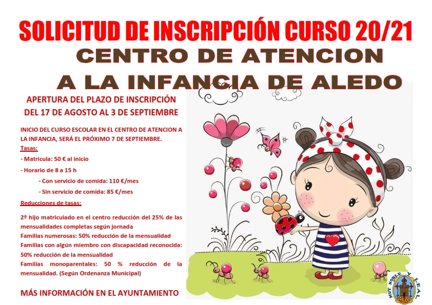 El plazo de inscripción es desde el 17 de Agosto al 3 de Septiembre. Este curso por las circunstancias especiales debido al Covid-19, se seguirán protocolos y medidas higiénico-sanitarias recomendadas por las autoridades sanitarias, para más información y formalizar inscripciones dirigirse a Ayuntamiento, o a través de la pagina www.aledo.es